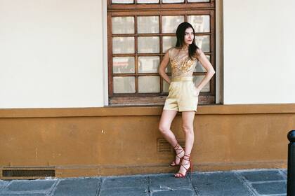 En la propuesta de hoy, el protagonista es un Body de tul transparente con bordados en flores, ideal para lucir ya sea con un short o una falda, o bien darle un toque de informalidad con un jean y convertirlo en “casualwear” (apto para todo el día). En este caso, como el outfit era para un evento, la opción fue inclinarse más por un estilo sensual y elegante optando por un monocromo en dorados y unas sandalias “lace up” con taco en color rojo.