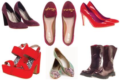Stilettos taco ancho $639 de Heyas / Slippers bordadas $671 de Le Loup / Stilettos de charol rojo $630 de Sofi Martiré / Sandalias de gamuza rojas $744 de Sofi Martiré / Chatitas reptil $695 de Abril Pereyra Lucena / Botas de charol bordó $575 de Corre Lola /