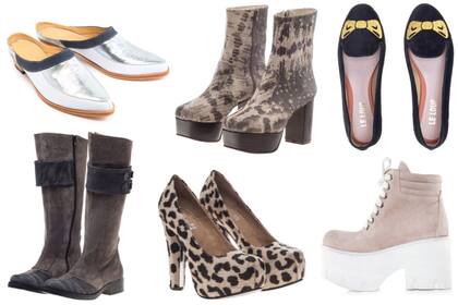 Zuecos chatos $918 de Victoria Hache / Botas reptil con taco $900 de Sofi Martiré / Slippers negras con moño bordado $671 de Le Loup / Botas grises caña alta $850 de Loli Van Harden / Sandalias animal print $900 de Sofi Martiré / Borcegos con plataforma $790 de Sarkany /
