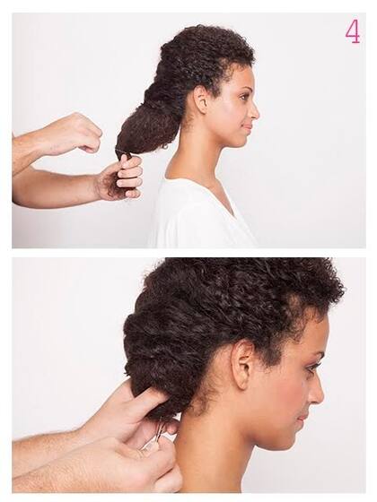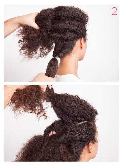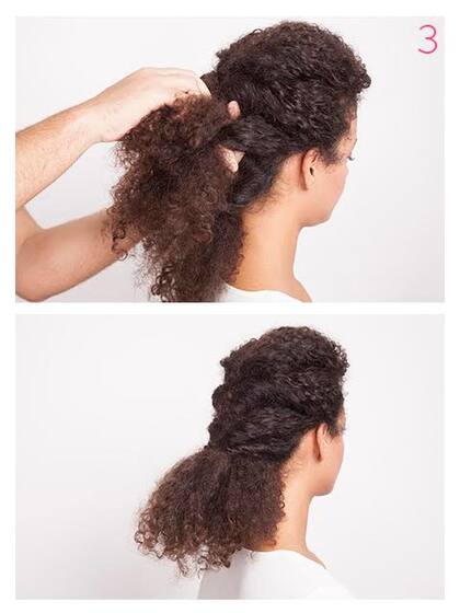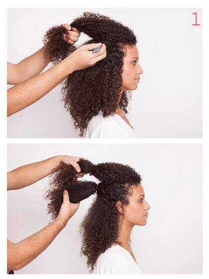 Dividir el pelo en partes arrancando desde arriba así tal cual se ve en la foto, y vamos haciendo colitas.