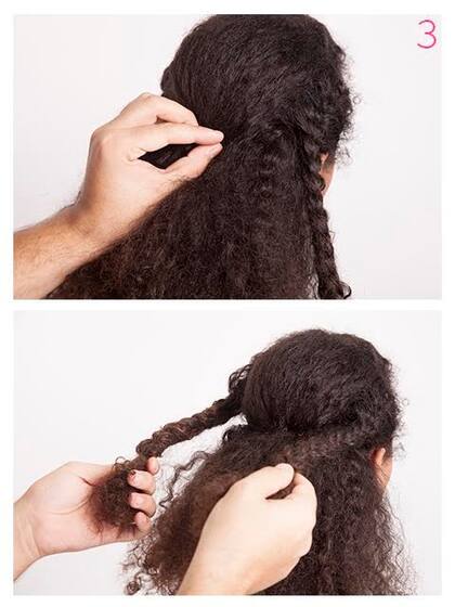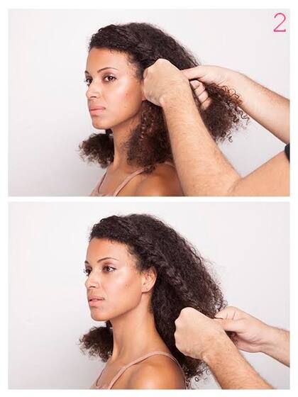 Lo mismo que en el paso 1, en este caso elegí hacer de costado la raya, así que tengo más cantidad de pelo para trabajar. La idea es que no quede tan pegada en la frente, sino con un poco de volumen así no queda tan chata, trenzar desde el frente hasta el final y sujetar con una gomita para el cabello.