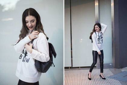 Las capuchas siempre otorgan a cualquier outfit un toque de informalidad, que viene propiamente de sus raíces asociadas con lo deportivo. En la propuesta de hoy, nos encontramos con un look “sporty deluxe” en el que el buzo con capucha es el protagonista y el que marca un estilo definido, una mezcla de algo mas casual con detalles que lo hacen mas arreglado. Eso si, aquí los zapatos con tacos y los pantalones de cuero ecológico serán claves justamente para no caer en el típico equipo para hacer footing.