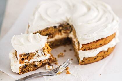 Batir las claras a nieve, junto con la pizca de sal. Por otro lado, mezclar la zanahoria, las yemas, el azúcar, el aceite de coco, el jugo de naranja y la esencia de vainilla. Y en otro bol, la avena, la canela, el polvo para hornear, las pasas y las nueces. Incorporar a las claras batidas a nieve la preparación líquida hasta unir todos los ingredientes y luego agregar los secos. Mezclar bien y pasar a un molde de silicona de 20 cm de diámetro. Hornear a 180 °C por 40 minutos. Retirar, dejar enfriar y cubrir con el frosting, que se hace simplemente mezclando todos los ingredientes.