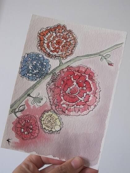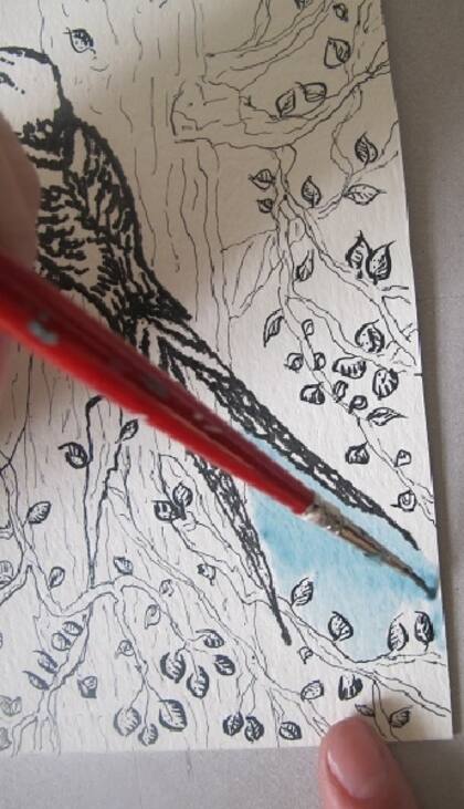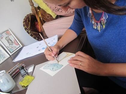 4) Cuando la tinta se seca, Valeria usa sus acuarelas, dándole color al dibujo.