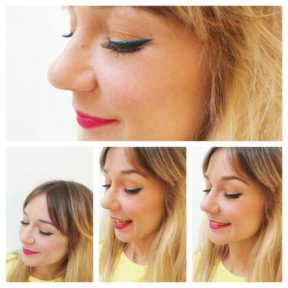 3. Le agregamos arriba una línea de color, el que quieran. Yo elegí este turquesa porque es el que tenía, es de una marca europea que se llama Kiko; tiene unos delineadores de colores que son de locos. La clave es no hacer la raya entera, sino cortar a la mitad del delineado negro. De otra forma el ojo se te pone demasiado redondo y no favorece para nada.