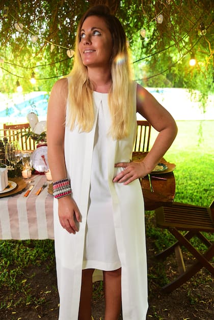 Este vestido en particular me pareció súper original: sale de la morfología que conocemos habitualmente y con la forma de mi cuerpo creo que se lleva bastante bien. Elegí usar sólo una pulsera tipo brazalete porque el escote no permite demasiado juego con un collar: quizás con algo largo iría, pero opté por el clásico “menos es más”. El otro toque de color se lo di con estos zapatos que reúnen dos colores poco discretos como son el fucsia y el verde. Si bien el blanco es un color más característico de los festejos de año nuevo, trato de usarlo siempre porque aliviana muchísimo el conjunto en general.