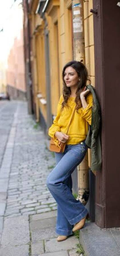 Para esta ocasión, elegí acompañar mi chaqueta "Army" con una blusa en color mostaza que tiene detalles de bordados muy delicados y un jean "pata de elefante", característico del movimiento "hippie". A este conjunto sumé una carterita de tipo bandolera y unas botitas en el mismo color.