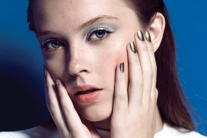 -Usando los dedos, aplicá la sombra plateada metalizada, esfumándola de adentro hacia afuera con golpecitos.