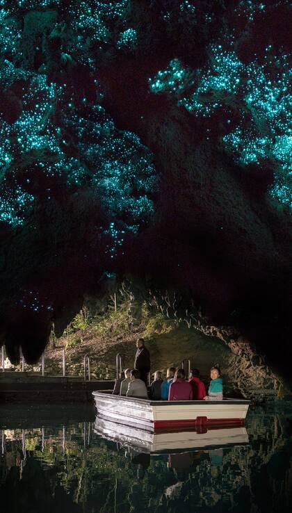 En la Isla Norte la erosión y el vulcanismo crearon varias cuevas, pero la más emblemática es la de Waitomo, donde un río subterráneo circula en las entrañas de la tierra y alimenta una serie de lagunas. Ese ámbito particular ha creado un inolvidable espectáculo natural. En la penumbra, el techo de la gruta se ve tapizado de miles de puntitos de luz. Son pequeñas larvas que emiten fluorescencia en la oscuridad para atraer a sus presas. Estos insectos viven exclusivamente en ambientes ciegos y húmedos. Para verlos se baja a lo profundo de la cueva por una rampa, deslizándose sobre la laguna con una lancha que flota lentamente bajo las mágicas lucecitas. También se las puede conocer de manera más dinámica: vistiendo un traje de neoprene y dejándose llevar por los rápidos, los remansos y las cascaditas del río hasta la cueva.
