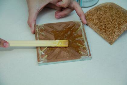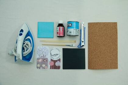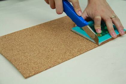4. Apoyá el azulejo sobre la plancha de corcho y recortá un cuadrado del mismo diámetro para realizar la base.