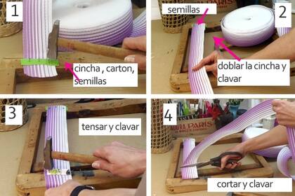 Entre las cinchas y las semillas se suele colocar un cartón (tapas de cuaderno, por ejemplo, de 1,5cm x 6 aprox.), para que la cabeza del clavo no rompa el tejido plástico .
