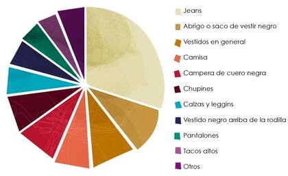 - El abanico de prendas, colores, estampados, diseñadores y décadas de la moda que se desprendió de los resultados es tan grande que no puedo enumerar a todos, me refiero a los resultados que forman el proncentaje "Otros" de cada gráfico. En algunos casos decidí contar un poco de qué se trata ese porcetanje porque me parece valioso, hubo veces en que me reí sola y varias en las que reflexioné. Por favor, nadie no se ofenda si no ve su respuesta escrita.