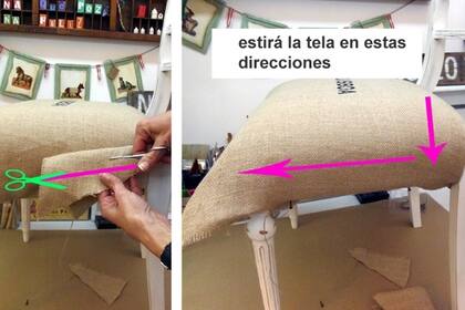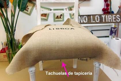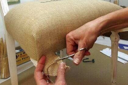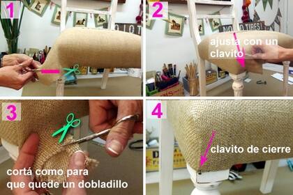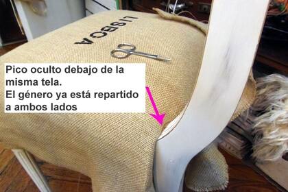 Antes de trabajar las esquinas, da vuelta la silla, chequeá que la tela esté tensa y hundí los clavitos .