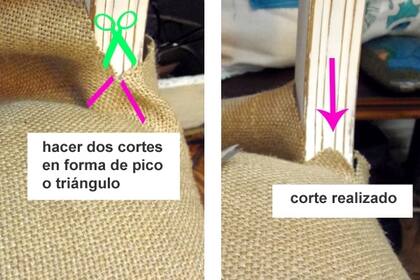 En la imagen izquierda, vemos que a pesar de haber cortado la tela aún no llega de manera cómoda a ambos lados . Para eso es necesario realizar un segundo corte en forma de pico , tal como se ve en la imagen de al lado. Tijera chiquita en mano, apuntá primero hacia un borde del respaldo . Hacé cortes pequeños hasta que la tela deje de "tirar" de ese lado. Repetí el corte en el borde opuesto.