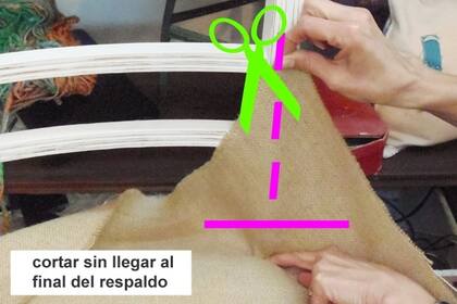 Ese va a ser el primer corte que permite repartir parte de tela hacia ambos costados. No llegues con la tijera hasta el final del respaldo, dejá sin cortar 3 cm aproximadamente.