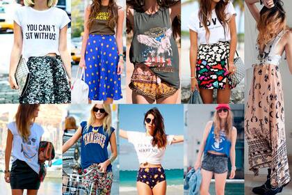 La remera estampada: Nada más simple y clásico en el guardarropas que una remera con alguna estampa o leyenda. Todas tenemos una pero solemos cometer el error de pensar que es solo para el día y que solo se puede combinar con un short o pollera de jean…¡No es así! No es pecado obviamente combinarla con estas prendas pero si lo haces y querés producirte un poco más, probá remera + short + camisola abierta + sombrero por ejemplo. Dentro de las tantas posibilidades de combinación que te ofrece una simple remera está la de generar un estilo indie remera + pollera larga hindú + sandalias tipo gladiador + muchas pulseras y collares, o también la podés usar en tus conjuntos nocturnos ¡Qué bueno que es cuando una prenda se puede usar a toda hora cuando de ahorrar espacio en la valija se trata! Probá remera + pollera de brillos o gasa + super tacos + lindo sobre.¡Hay mil maneras de que una remerita ya usada te quede muy canchera, fijate en la cantidad de looks que encontramos!