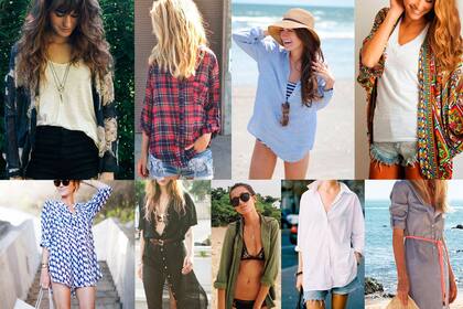 Camisas y Kimonos: ya todas sabemos que los kimonos son un must esta temporada, los usas en la playa, en la calle, en el bar, en fin son lo máximo y no hay discusión pero no nos olvidemos que esas camisas de hombre que les hicimos rescatar en el invierno también son ultra prácticas en las vacaciones de verano. Una camisa xl o un kimono + bikini + sombrero + anteojos para cualquier día de mar, protejen del viento, del sol y muchas nos sentimos más cómodas con algo más de ropa que una simple bikini. De noche también van, una camisa oversize arremangada + collar + sandalias altas es una buena opción.