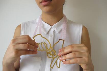Con materiales atípicos, la diseñadora crea piezas modernas y vanguardistas, como pequeñas obras de arte. Hace anillos de compromiso, inmensos collares, prendedores y cadenitas con frases copadas.