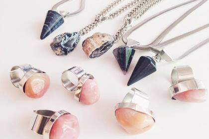 Mica Cosidoy confecciona con sus propias manos los aros, anillos, collares y pulseras con dijes, cadenas y muchas piedras de colores. De lunes a viernes por la tarde podés visitar su showroom en Palermo.