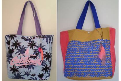 Bolsos de lona con estampas de flores, palmeras, peces, estrellas, hojas tropicales y sirenas para la playa o la ciudad. La confección de las piezas se realiza artesanalmente.