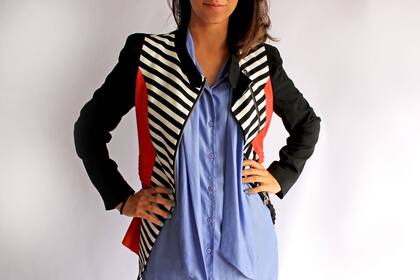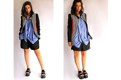 Este look, que es ideal para un cóctel o evento similar, esta compuesto por una camisa bien grande color lavanda (siempre que armamos conjuntos con toques masculinos es importante que algún detalle sea femenino y el recurso del color es muy simple y efectivo) una bermuda que es de raso negra ideal para salir, se puede combinar con remeras estampadas para lograr un outfit más casual, en los pies unas plataformas súper altas, también podrían ser stilettos o sandalias con taco, y como abrigo para estas noches en las que resfrescó un poco elegimos un blazer sastrero con un mix de rayas y coral que va muy bien con el lila y el negro.