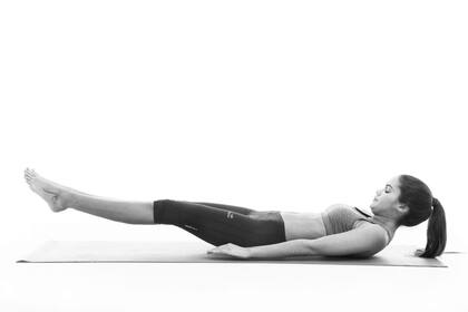 Inhalá inflando las costillas y, al exhalar, subí la cabeza desde la fuerza abdominal y estirá las piernas en diagonal (foto 2). Repetilo 10 veces.