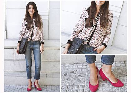 Look: jean ajustado a los tobillos, camisa de seda estampada con bolsillo y cuello en a contratono en negro, zapatos taco bajo flúo y maxi sobre negro matelassé con tira de cadena y cuero.