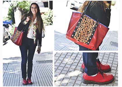 Look: jean oscuro, camisa blanca, cardigan estampado, saco negro, borcegos caña corta rojos charolados y bolso con recorte en animal print de su propia colección.