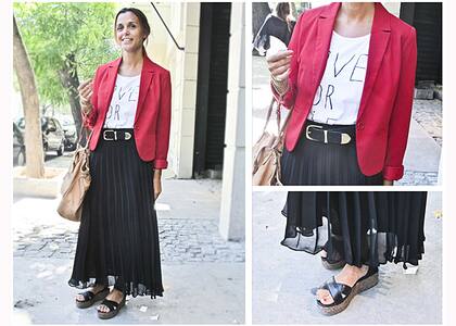 Look: Pollera larga plisada en color negro, remera con inscripción, saco sastrero rojo, cinturón de gamuza con hebilla en plata, maxi bolso de cuero camel y sandalias con plataforma de corcho.