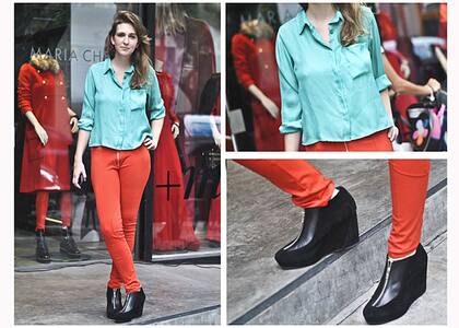 Look: leggings rojos con cierre, camisa de raso verde esmeralda y botinetas de gamuza y cuero.