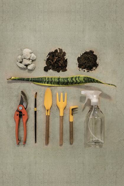 1. Piedritas. / 2. Chips de corteza de pino para agregar al sustrato. / 3. Sustrato. / 4. Tijera de podar. / 5. Pincel para limpiar las plantas. / 6. Pala y rastrillos para remover la tierra. / 7. Pulverizador. También está bueno que tengas guantes protectores y una regadera.