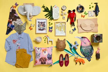 En la foto: camisa y pantalón, $1799 y $599, Yagmour. Neceser, Pesqueira, $440. Sellos, Taller Ramos Generales, de $75 a $140. Portasahumerio "Gatito", Magnolia, $550. Mariposas, Barrio Chino, $20 cu. Elefante, Tienda Handmade, $1150. Cuadro "Tigre", Chimi, $579. Zorro rojo, Pique-Nique, $600. Pañuelo, Fruto, $710. Bastidor "Oso", Bizz Ideas Bs. As., $490. Serigrafía, Ana Sanfelippo, $300. Ballena, Guardabosques, $250. Espejo "Gato", Piuke, $950. Taza de oso, Geranio, $300. Unicornio, Mundo Paolina, $850. Cuadro, Regina, $3300. Obra "Oso y niña", Bárbara Magnoni Serie Bosque, $3200. Almohadón, Jazmeen Deco, $890. Cabeza de lobo, Zeta, $380. Slippers, Amhuler, $3190. Perro celeste, Mil Gracias, $540. Zorro, Guardabosques, $250. Vinilo de pájaro, Mutta!, $690. Lata, Oliverta, $500. Maceta "Liebre" rosa, Bosque Arte y Botánica, $550.