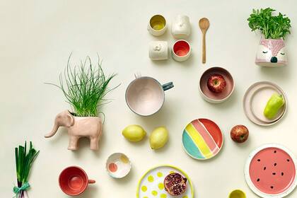 Taza (Bosque / $370), cazuela Sandía (La Frutería / $90), vasitos amarillos (Cerámicas Ángeles Castro Corbat / $110 c/u), vasito verde (Cerámicas Ángeles Castro Corbat / $110), taza “Hojas” (Mundo Cacharro / $400), plato Flor (Mundo Cacharro & Solo Para Mí / $300), bol Lunas (Tienda Pina / $500), plato con flores y rayas (Mundo Cacharro / $450), compotera Kiwi (La Frutería / $165), minicazuela Kiwi (La Frutería / $70), cazuela Kiwi (La Frutería / $90), tetera (Inside Tea Connection / $920), perrito (Marina Stímolo & Bosque / $1100) y maceta (Amor Natural / $150).