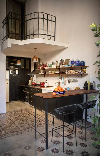 La cocina la hicieron de nuevo: negro para los muebles de madera, que contrastan con los azulejos blancos. Un desayunador de diseño propio y vajilla heredada. El balconcito que corona la cocina da a una habitación que, en el futuro, será el cuarto de Juana.