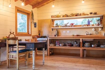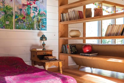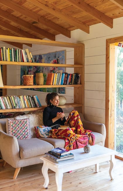 Es un rectángulo, la casa. Una biblioteca sin fondo separa el área social del cuarto, que tiene una cama baja sobre pallets en el piso. En el centro de la casa hay una estufa de bajo consumo, de madera por dentro y de adobe por fuera, que Jade pintó este verano con arcilla, agua y óxidos. La cocina, integrada al espacio, es de madera y microcemento, con luz natural y todo a la vista.