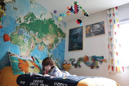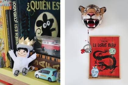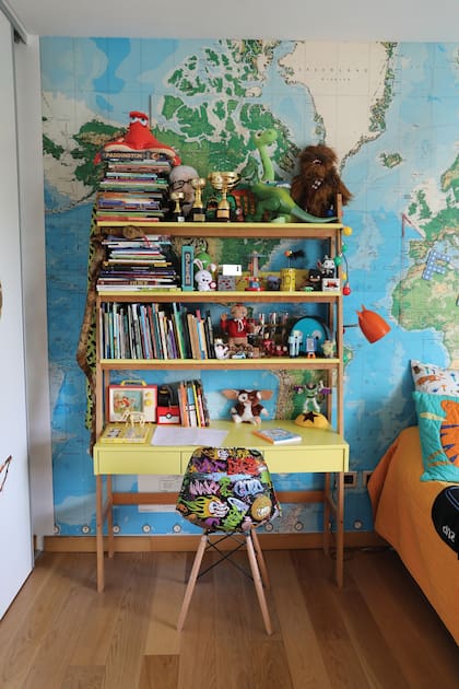 El cuarto de Fermín se organizó tomando como base al mural mapamundi autoadhesivo, con una paleta que respetara esos colores. En esta habitación sobran los libros y las referencias de películas. En las paredes, afiches enmarcados con ilustraciones del siglo XIX decoran un ambiente cargado de líneas y fantasía, que se complementa con muñecos y objetos referentes de distintos clásicos.