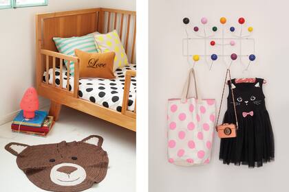 Anahí Bangueses armó estos cuartos minimalistas para sus hijas Eloísa y Olivia. Duermen en habitaciones diferentes, pero comparten el estilo y la decoración. Las dos camas fueron fabricadas a medida por un ebanista en madera lenga y ambas tienen acolchados de lunares y almohadones con diferentes estampados llenos de colores.