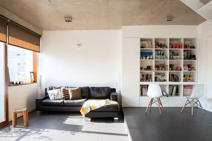 Es un gran ambiente en el que el living está conectado al comedor y a la cocina, con cielos rasos de hormigón a la vista y paredes blanquísimas. En esa especie de SUM que es la planta baja la familia se encuentra al regreso del trabajo y de la escuela. Para armar un espacio chill out permanente, pusieron pufs –Ángela está sobre un Gran Jack habano de Quiero Esto, $2300– y, para mirar la tele, un sillón oscuro al que le dieron un punch de color con una manta a cuadros (Pehache, $1860).
