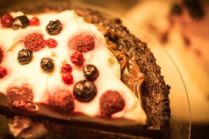 OH! Menú: porción de torta OHLALÁ!, una marquise de choco blanco, dulce de leche, crema de cacao y merengue de frutos rojos con nueces + bebida caliente.