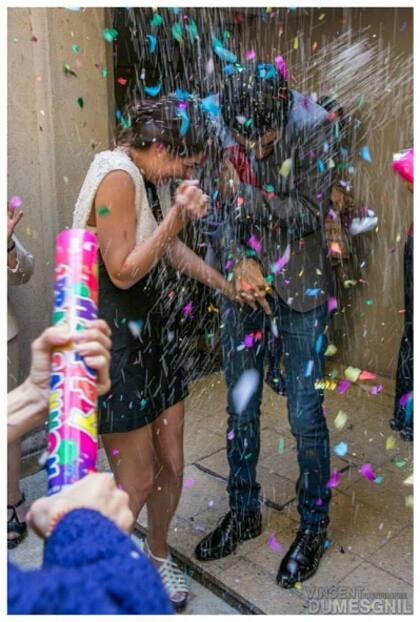 3. Cuando salimos, nuestras familias y amigos nos esperaban con una lluvia increíble de arroz y de papelitos de colores. Mi vestido se quedó toda la tarde con marquitas blancas que le dejó el arroz, insacables, ¡pero qué divertido estuvo! Además, una amiga de Nacho llevó pétalos de rosas, que no sé de dónde los habrá sacado pero quedaron re lindos en las fotos.
