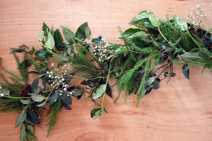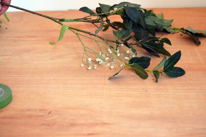 Paso 1. Armá el camino verde. Cortá varias ramitas de los diferentes verdes para formar el camino del largo que deseemos cubrir en la mesa. Con la cinta floral verde, vas a unir entre sí las ramitas, intercalando los diferentes tipos de follaje.