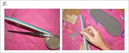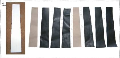 Hacer la moldería de las tiras en cartulina, es un rectángulo de 4cm de ancho de un lado, 6 cm del otro y 27,5cm de largo (son tiras largas para que haya sobrante suficiente para pegarlas). La moldería se prueba sobre el pie de cada uno antes de cortar. Cuando tenemos verificados los moldes cortamos 6 tiras de cuero y 2 tiras de lo que vayan a usar de material exterior, en este caso lona que vamos a estampar después. Como la lona es finita usamos un cuero grueso para el interior. Cortamos.