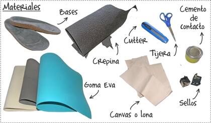 Cuero, lona y tintas para serigrafía o pintura para tela (si las van a hacer igual a estas, sino puede ser el mismo cuero o gamuza), bases tipo "birken", goma eva de 5mm (pueden usar otros anchos), cemento de contacto, tijera, centímetro, lápiz, cutter, regla, lija y para la suela puede ser crepina como usamos nosotras o pueden comprar un suelín que ya viene cortado listo para pegar.