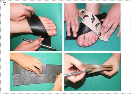 Ahora vamos a armar la parte superior de las sandalias que es lo más complejo: apoyamos el pie que va a lucir estas bellas sandalias sobre la base y ubicamos a nuestro gusto las tiras, tener en cuenta que para que sean mas cómodas, hay que cubrir lo mas posible el empeine y los dedos, ponerlas también bien ajustadas porque el cuero estira un poco. Luego, marcamos sobre la tira y sobre el borde de la base estas ubicaciones para después saber exacto donde pegar. Para marcar el otro pie copiamos en espejo todas las marcas.