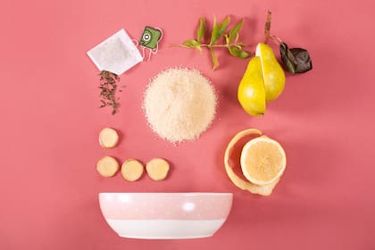 - Llevar el azúcar y el agua a una olla profunda y cocinar hasta que se disuelva el azúcar. Agregar al almíbar la piel y el jugo de un limón, las vainas de cardamomo, las hojas de cedrón, el jengibre y el té verde. Dejar infusionar 5 minutos.