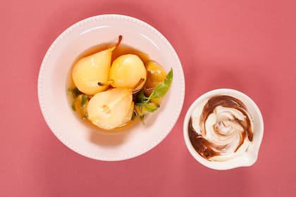 - Una vez que el almíbar esté listo, agregar las peras sin el agua. Cocinar hasta que estén tiernas pero no deshechas. El tiempo de cocción dependerá de qué tan maduras estén. Apagar el fuego y retirar las peras. Cuando el almíbar este frío, guardarlas en un frasco. Servir con una mezcla de mascarpone y crema batida con ganache de chocolate.