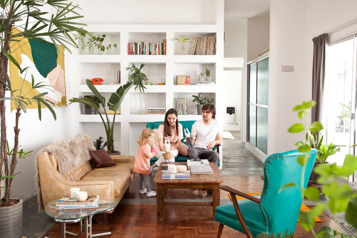 Agostina Sacco y Mariano Martiarena son los creadores de Linneo, una boutique de plantas que también diseña y produce su propia línea de macetas y accesorios. La casa matriz está en Tucumán (donde nació Agos), pero ahora tiene esta sucursal en Villa Crespo que funciona como un showroom. Mariano es botánico, Agostina es arquitecta y ella, desde su estudio Multiestudio, que funciona en este mismo espacio, trabaja para unir sus proyectos de arquitectura con el paisajismo. Pero, además, acá viven, porque también son socios en la vida y los padres de Roma, que tiene 2 y que crece rodeada de plantas.