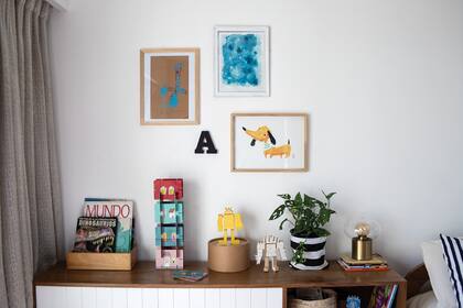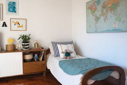 "Terminé el cuarto de Ama en cuarentena", cuenta. Eligió un mueble de guardado (Carola Mauer) y una cama antigua, que vistió con almohadones rayados y un cubreedredón haciendo juego. Como detalles: velador (Cari Ríos), robots de madera (Juguetes Fogi), casita armada (Amor Mío), cuadro con perro salchicha (Monoblock) y una plantita que cuida Amador. "Cuando está medio loco, nos ponemos a regar. Mete las manos en la tierra y ¡listo! Las plantas te conectan con lo simple".