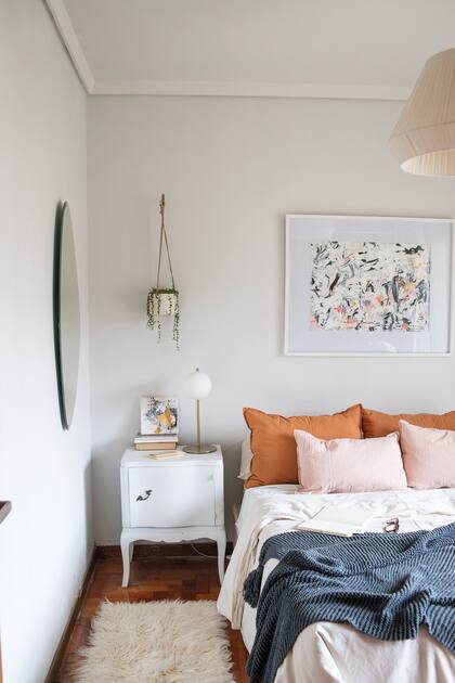 "Amo mi cuarto –dice Flor–. Ahora, está en su máximo esplendor". El cuadro de Ana Chaveros que decora el respaldo de la cama es el gran protagonista. De él, se desprenden los colores de los almohadones (Teodolina Deco) y el pie de cama (La Vie). La mesa de luz es parte del juego de la cómoda que tiene en la cocina y que pintó de blanco. Sobre ella, velador Ballon en cobre (Casa Tilia) y un cuadrito como extensión de la obra principal. El espejo Gota (Cari Rios) le da un toque especial al ambiente: "Tiene un juego de reflejos con el cuadro y la maceta que me encanta".