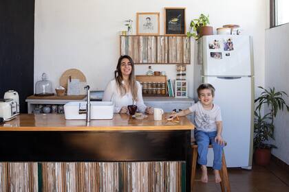 Flor no quería una cocina convencional. Le llevó un mes transformar el jardín de invierno en este espacio que hoy es el alma de la casa. Diseñó sobre un papel las líneas de esta barra que divide y hace de lugar de encuentro. Para darle personalidad, le sumó unas placas que hizo el artesano Marcos Masciangelo con persianas recuperadas, de la zona del Delta.